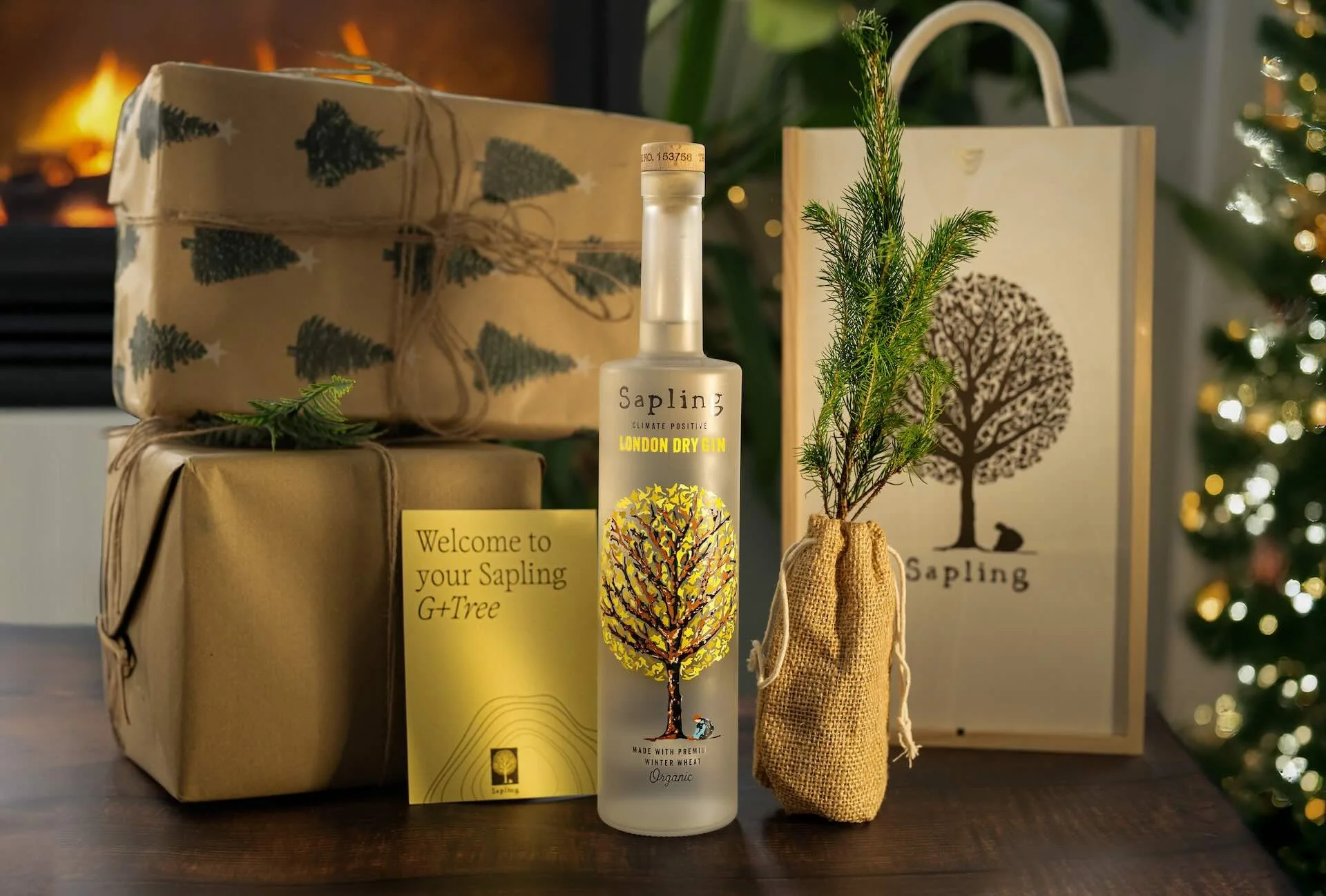 Sapling’s Climate Positive Gift Box pairs a bottle of their smooth, zesty London Dry Gin with a real Christmas Tree sapling, ready to plant and grow.